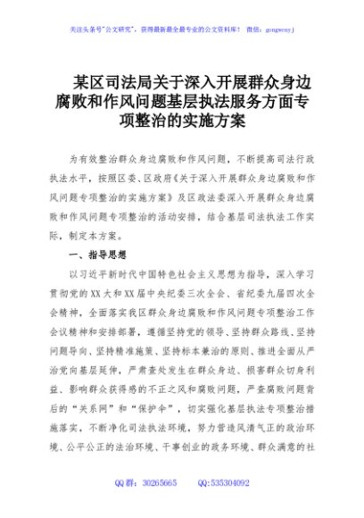 / 某区司法局关于深入开展群众身边腐败和作风问题基层执法服务方面专项整治的实施方案