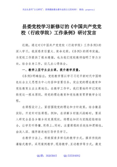 / 县委党校学习新修订的《中国共产党党校(行政学院)工作条例》研讨发言