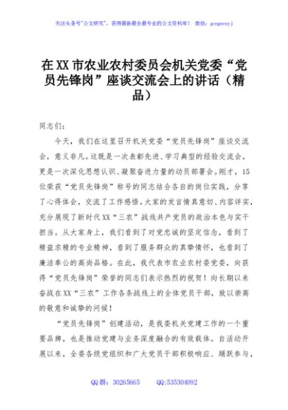 / 在XX市农业农村委员会机关党委“党员先锋岗”座谈交流会上的讲话(精品)
