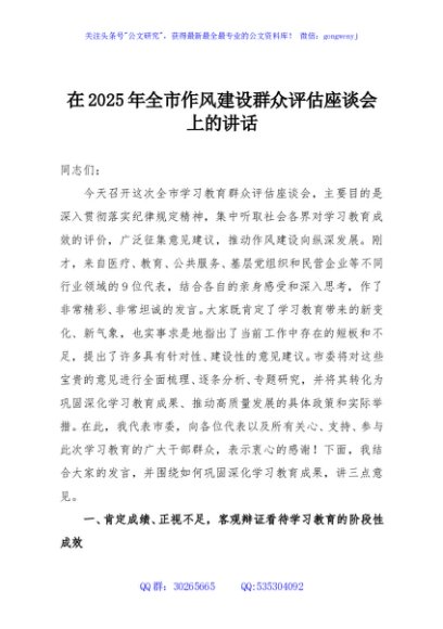 / 在2025年全市作风建设群众评估座谈会上的讲话