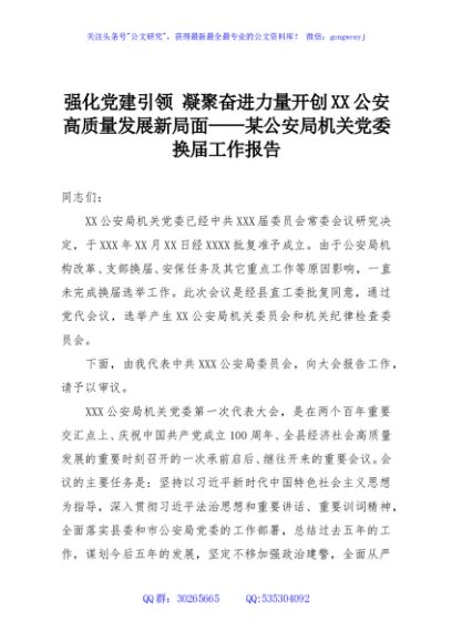 / 强化党建引领 凝聚奋进力量开创XX公安高质量发展新局面——某公安局机关党委换届工作报告