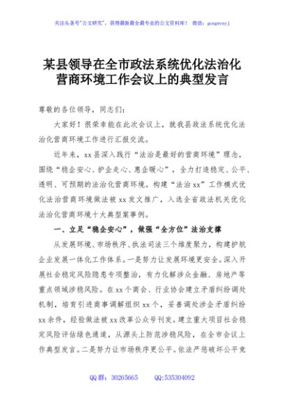 / 某县领导在全市政法系统优化法治化营商环境工作会议上的典型发言