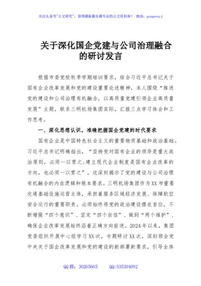 / 关于深化国企党建与公司治理融合的研讨发言