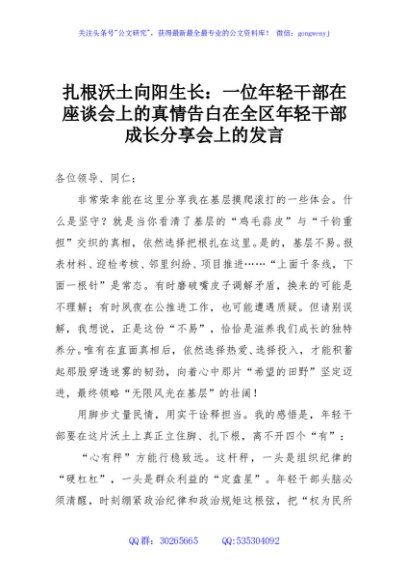 / 扎根沃土向阳生长:一位年轻干部在座谈会上的真情告白在全区年轻干部成长分享会上的发言