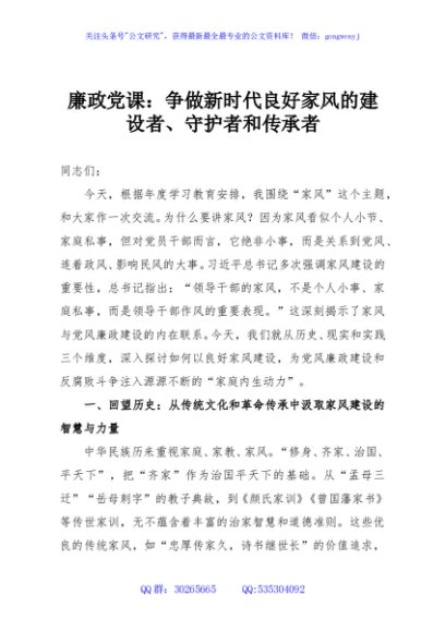 / 廉政党课:争做新时代良好家风的建设者、守护者和传承者