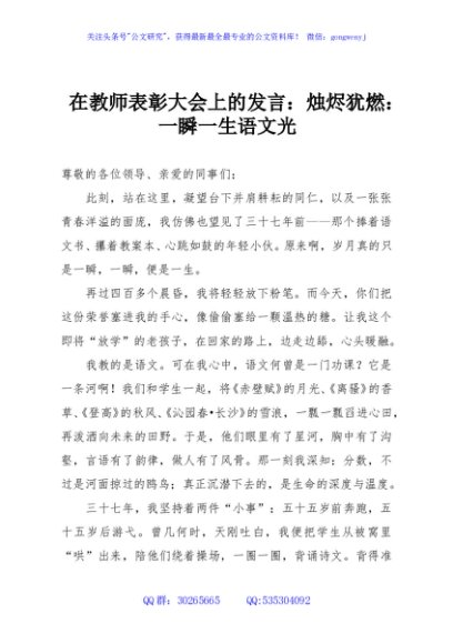 / 在教师表彰大会上的发言:烛烬犹燃:一瞬一生语文光