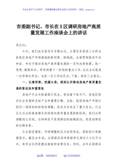 / 市委副书记、市长在X区调研房地产高质量发展工作座谈会上的讲话