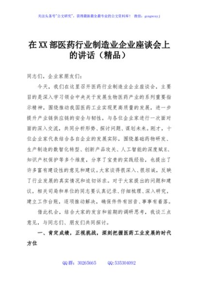 / 在XX部医药行业制造业企业座谈会上的讲话(精品)