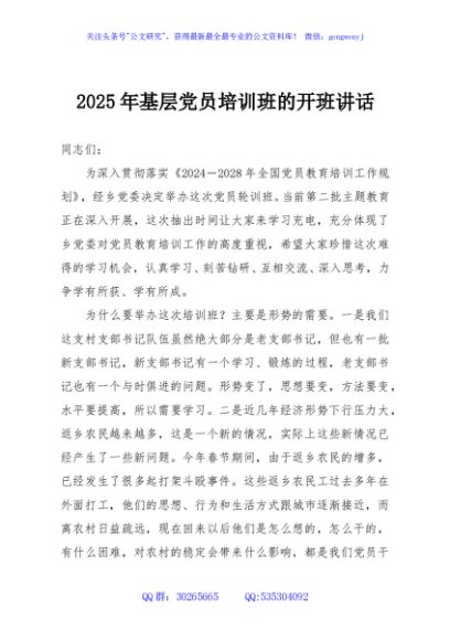 / 2025年基层党员培训班的开班讲话