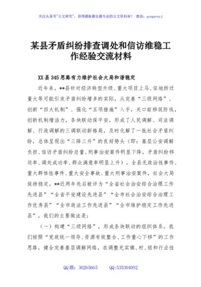 / 某县矛盾纠纷排查调处和信访维稳工作经验交流材料