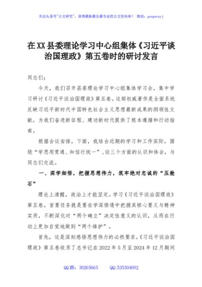 / 在XX县委理论学习中心组集体《习近平谈治国理政》第五卷时的研讨发言