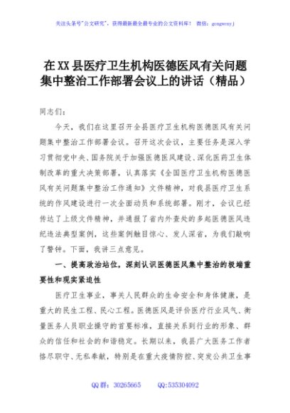 / 在XX县医疗卫生机构医德医风有关问题集中整治工作部署会议上的讲话(精品)