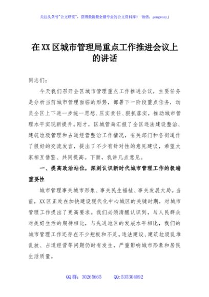 / 在XX区城市管理局重点工作推进会议上的讲话