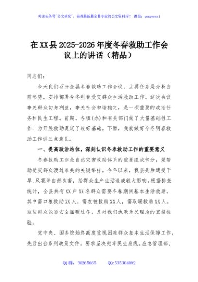 / 在XX县2025-2026年度冬春救助工作会议上的讲话(精品)