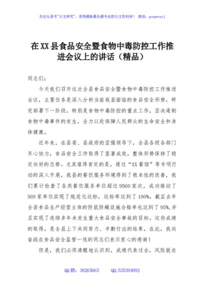 / 在XX县食品安全暨食物中毒防控工作推进会议上的讲话(精品)