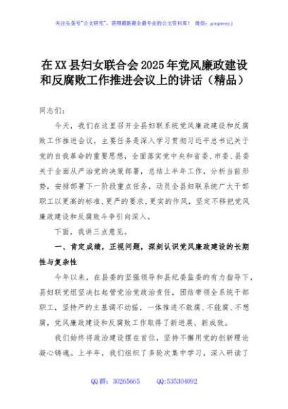 / 在XX县妇女联合会2025年党风廉政建设和反腐败工作推进会议上的讲话(精品)