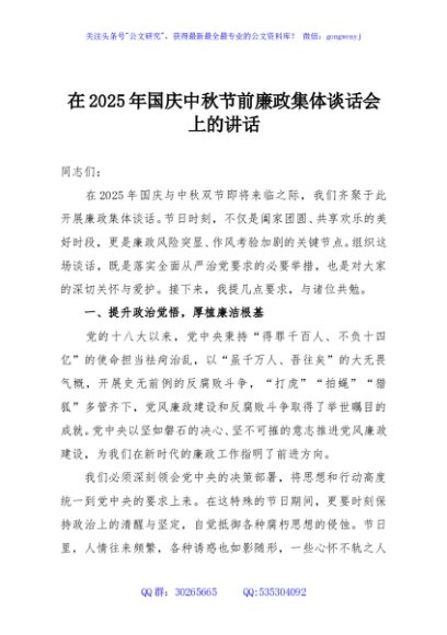 / 在2025年国庆中秋节前廉政集体谈话会上的讲话