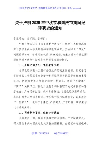 / 关于严明2025年中秋节和国庆节期间纪律要求的通知