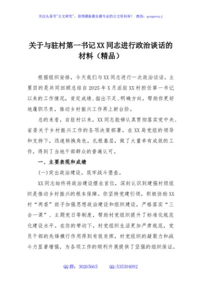 关于与驻村第一书记XX同志进行政治谈话的材料(精品)
