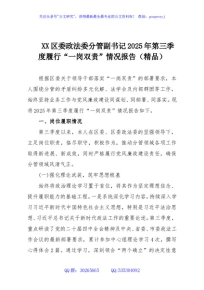 / XX区委政法委分管副书记2025年第三季度履行“一岗双责”情况报告(精品)