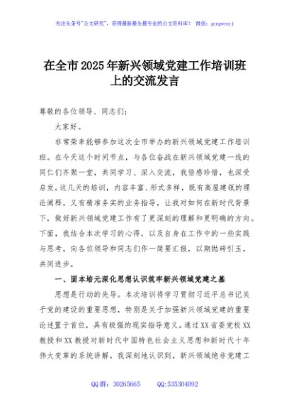 / 在全市2025年新兴领域党建工作培训班上的交流发言