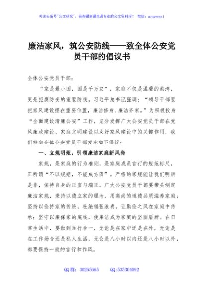 / 廉洁家风,筑公安防线——致全体公安党员干部的倡议书