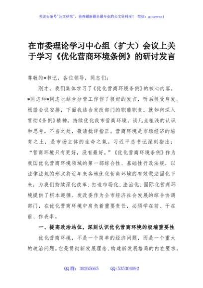 / 在市委理论学习中心组(扩大)会议上关于学习《优化营商环境条例》的研讨发言