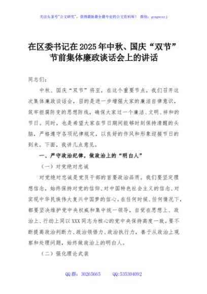 / 在区委书记在2025年中秋、国庆“双节”节前集体廉政谈话会上的讲话