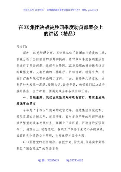 / 在XX集团决战决胜四季度动员部署会上的讲话(精品)