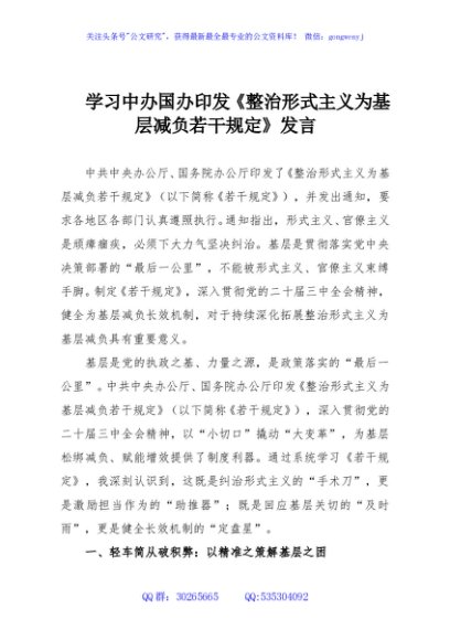 / 学习中办国办印发《整治形式主义为基层减负若干规定》发言