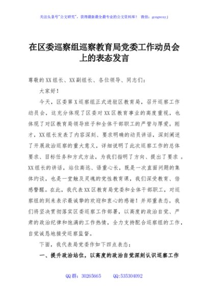 未生成预览图,长按二维码添加 在区委巡察组巡察教育局党委工作动员会上的表态发言 - 公文研究