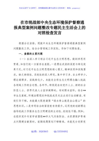 / 在市统战部中央生态环境保护督察通报典型案例问题整改专题民主生活会上的对照检查发言