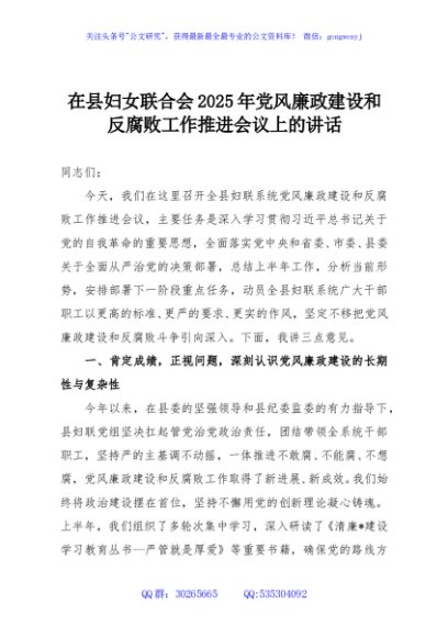 / 在县妇女联合会2025年党风廉政建设和反腐败工作推进会议上的讲话