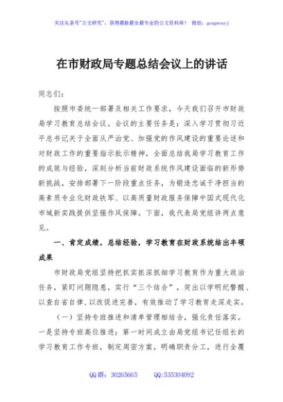 / 在市财政局专题总结会议上的讲话