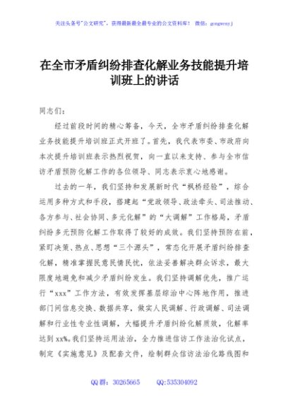 / 在全市矛盾纠纷排查化解业务技能提升培训班上的讲话