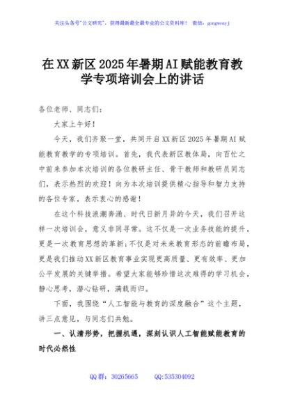 / 在XX新区2025年暑期AI赋能教育教学专项培训会上的讲话