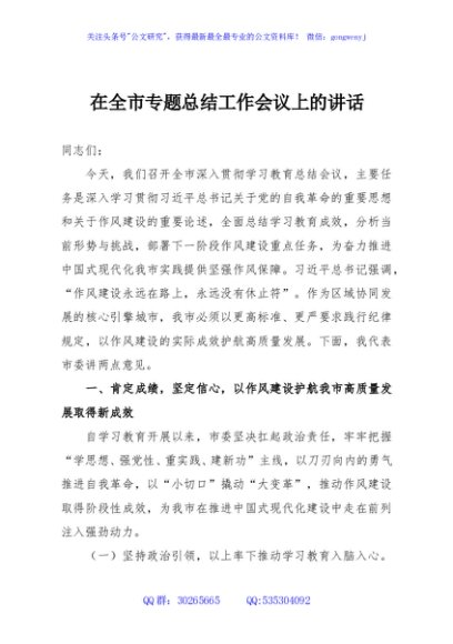 / 在全市专题总结工作会议上的讲话