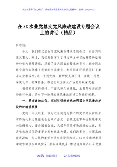 / 在XX水业党总支党风廉政建设专题会议上的讲话(精品)