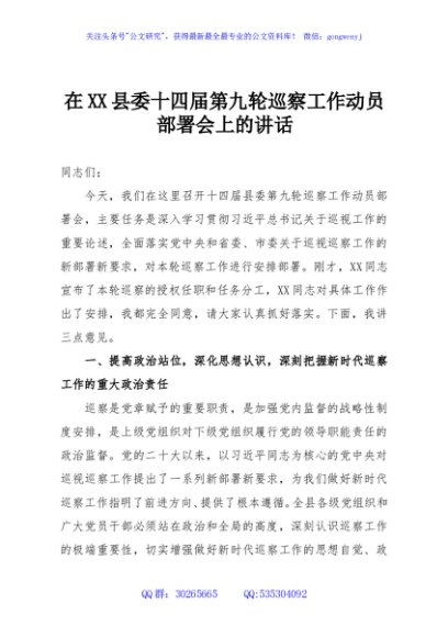 / 在XX县委十四届第九轮巡察工作动员部署会上的讲话