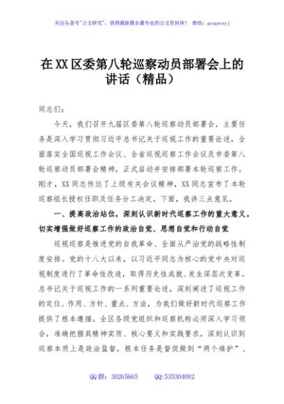 / 在XX区委第八轮巡察动员部署会上的讲话(精品)