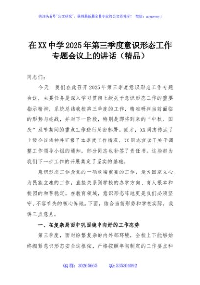 / 在XX中学2025年第三季度意识形态工作专题会议上的讲话(精品)