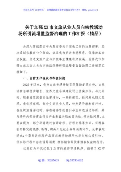 关于加强XX市文旅从业人员向宗教活动场所引流增量监督治理的工作汇报(精品)