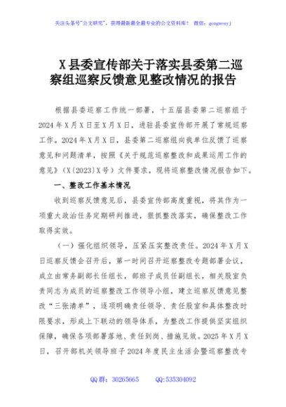 / X县委宣传部关于落实县委第二巡察组巡察反馈意见整改情况的报告