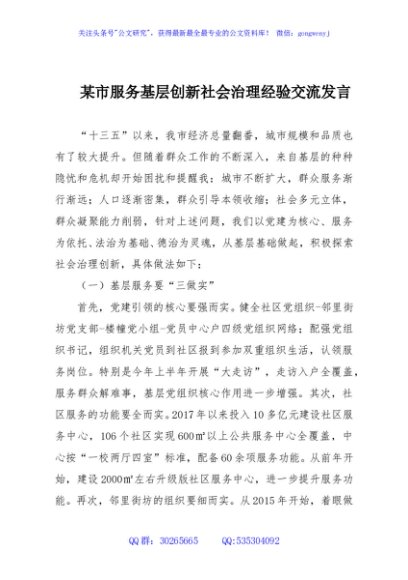 / 某市服务基层创新社会治理经验交流发言