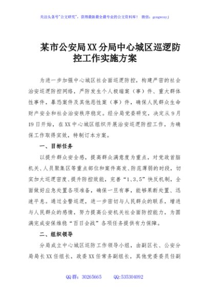 / 某市公安局XX分局中心城区巡逻防控工作实施方案