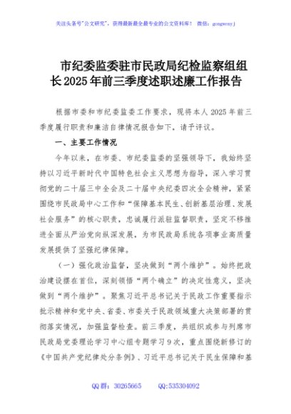 / 市纪委监委驻市民政局纪检监察组组长2025年前三季度述职述廉工作报告