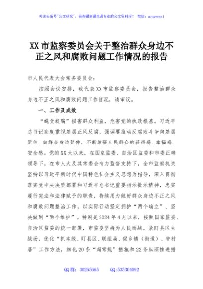 / XX市监察委员会关于整治群众身边不正之风和腐败问题工作情况的报告
