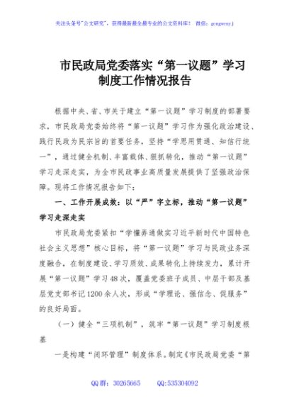 / 市民政局党委落实“第一议题”学习制度工作情况报告