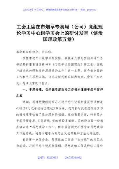 / 工会主席在市烟草专卖局(公司)党组理论学习中心组学习会上的研讨发言(谈治国理政第五卷)