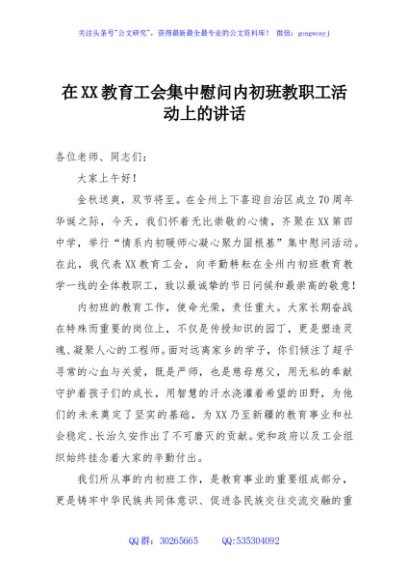 / 在XX教育工会集中慰问内初班教职工活动上的讲话